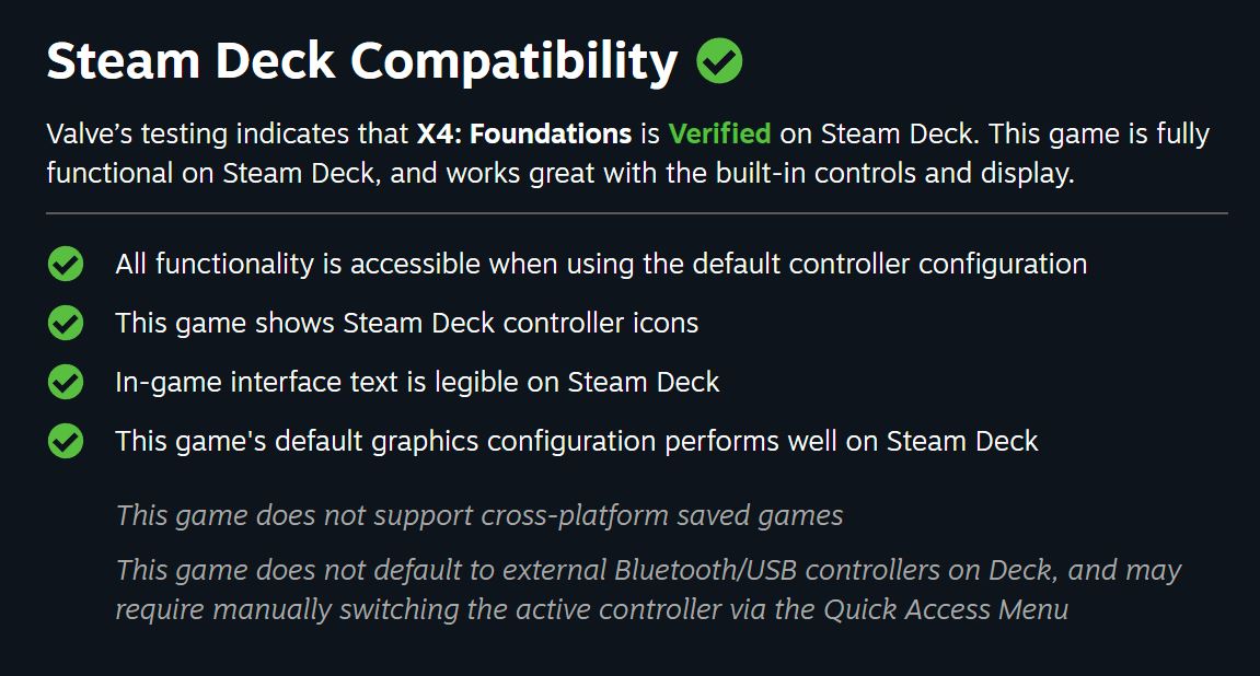 We've got some good news to coincide with the Steam Deck's one-year anniversary, which is being celebrated on Steam this week. Having made some changes for the upcoming major 6.00 update of X4: Foundations, the Steam Deck classification of X4 has been upgraded from "playable" to "verified" status. This means that from version 6.00 onwards, X4: Foundations will be fully Steam Deck verified! Yay, X4 on the go!
